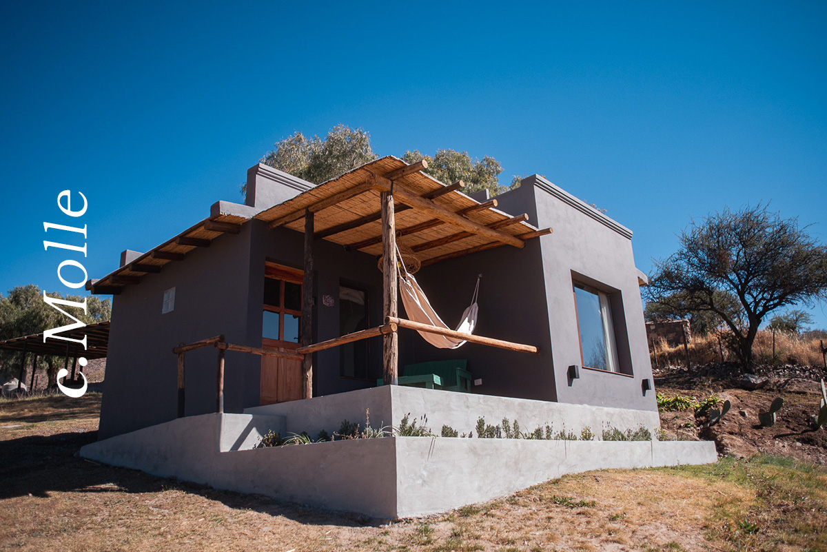 Nuestra casa de 50 m² fue diseñada especialmente para disfrutar de a dos, aunque cuenta con la posibilidad de recibir hasta 4 personas. Tiene un dormitorio con somier king size, living-comedor con sillón cama, baño, cocina y galería con vista al valle.